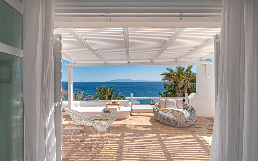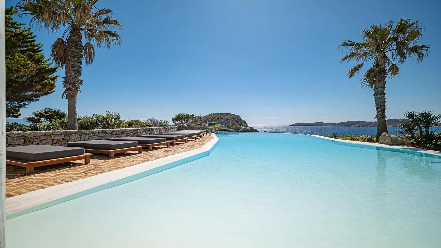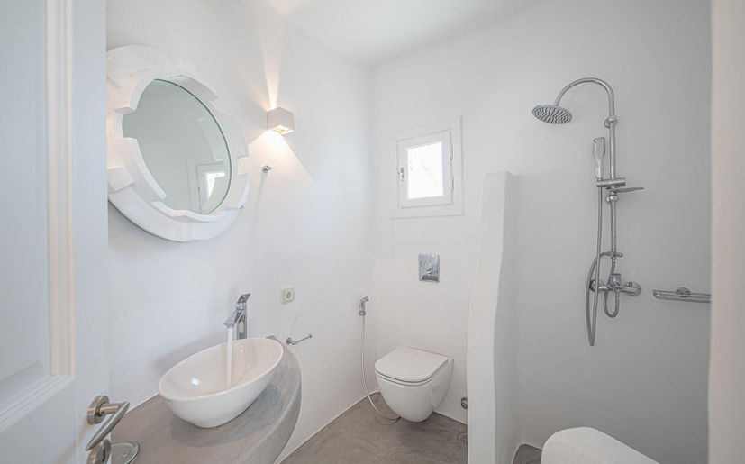 Arte villa 5 unfolds in three levels giving a possibility of interior autonomy: Entrance floor:fully equipped kitchen, living room with TV, [A/C], fireplace, indoor dining area [8 seats] Room 1:Queen bed, [A/C], TV, safebox, bathroom with shower - access to a balcony with sea view Upper level Room 2:Queen bed, en-suite bathroom with shower - access to a veranda withvia balcony doors Room 3:Queen bed,en-suite bathroom with shower - access to a spacious veranda with pergola via balcony doors Outdoor area Entrance level :Infinity pool [70 m2], 2 outdoor dining areas [10 guests], pergola, lounge area, portable BBQ Guest house:Queen bed, en-suite bathroom with shower | individual entrance