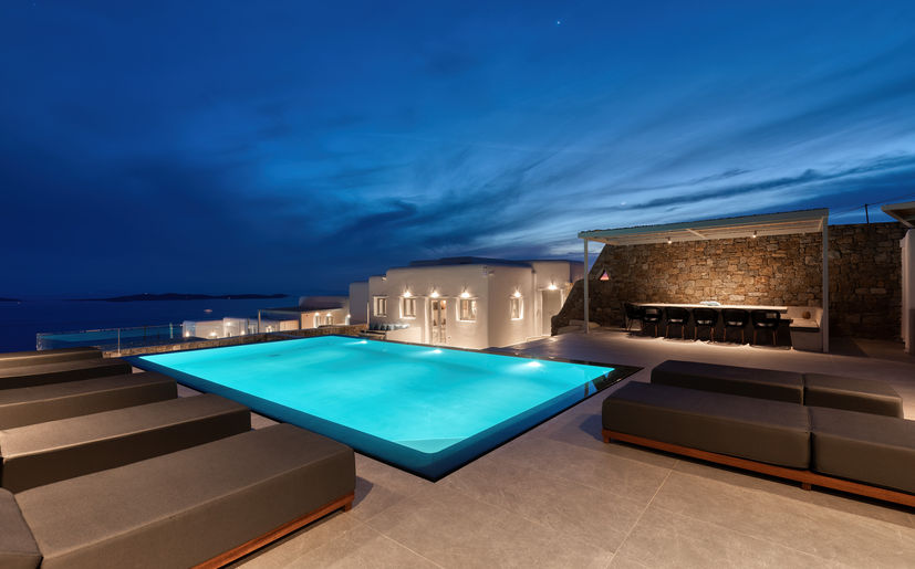 Located at Faros area. A 2 level luxurious villa, part of a glorious complex of Villas and Suites. Located at the highest point of the complex, with views that range from the island of Tinos to the island of Delos. Ground level: living room, kitchen, dining room, guest’s W.C.. One master bedroom with (160cm*200cm) & one master bedroom with two single beds (100cm*200cm). Upper Level: two master bedrooms with a double bed each (160cm*200cm) & a master bedroom with two single beds (100cm*200cm).